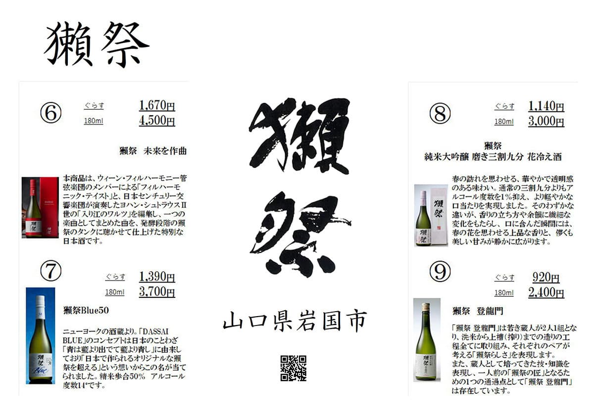 - 獺祭(山口):フルーティーで華やかな香りが魅力